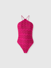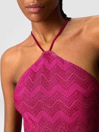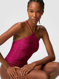 Zig zag lamé viscose one-piece swimsuit with halter neck