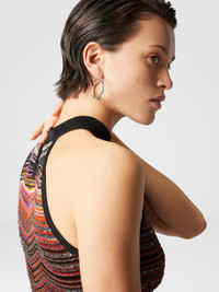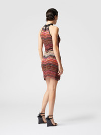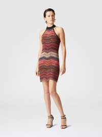 This sleeveless halter neck mini-dress features a lame chevron knit embellished with sequins that give a seductive glow. The sleeveless style and halter neckline emphasize a modern and bold line, revealing Missoni's sartorial mastery in combining fine materials with contemporary designs. MORE DETAILS - Long dress - Chevron Processing - Lame filaments - Decorative Sequins - Neck strap Composition: EXTERNAL:79%Rayon, 10%Metal Fiber, 6%Polyamide, 5%Polyester; LINING : 82%Polyester, 18%Elastane Care instructions: Dry cleaning in tetrachloroethene - mild process ; Ironing maximum temperature 110°C - without steam ; Wash in net bag ; Wash inside out ; Iron inside out ; Do not tumble dry ; Dry flat ; Do not wash ; Do not bleach Made in: Italy Product ID DS25SG23BK045DSM9MI