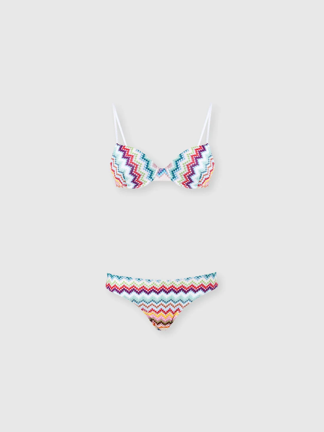 Inspired by Missoni’s artisanal savoir-faire, this women’s balconette bikini in viscose lame reinterprets the zigzag motif with a new pixel effect. Crafted with raschel workmanship, it envelops the body with natural elegance, blending luminosity and graphic design. MORE DETAILS - Women's balconette bikini - Raschel knit - Micro zigzag pixel-effect pattern - Viscose lame Composition: EXTERNAL:83%Rayon, 17%Metal Fiber; LINING : 80%Polyamide, 20%Elastane Care instructions: Hand wash ; Do not tumble dry ; Do not dry clean ; Do not iron ; Cool Hand Wash ; Do not bleach Made in: Italy Product ID MC22SP01BR014FSM9WV