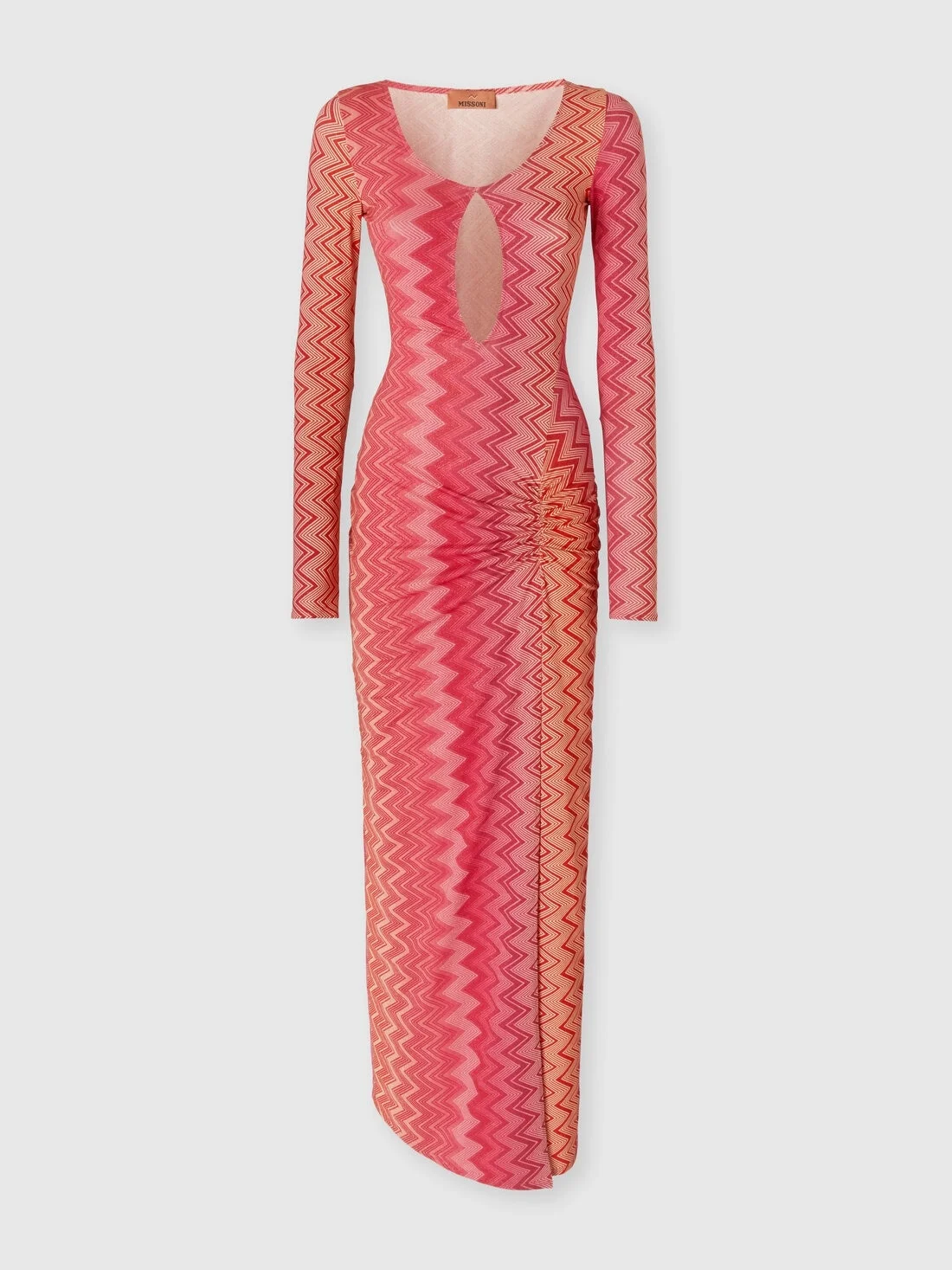 Lame cover-up dress with the maison's iconic zigzag motif and a delicate drape on the side. The sleeves and long skirt create a fluid and elegant silhouette, while the uncovered cut-out detail adds a sensual and contemporary touch. MORE DETAILS - Lame cover-up dress - Long sleeves - Iconic zigzag pattern Composition: EXTERNAL:42%Metal Fiber, 42%Polyamide, 16%Elastane Care instructions: Ironing maximum temperature 110°C - without steam ; Dry cleaning in tetrachloroethene ; Do not tumble dry ; Do not wash ; Do not bleach Made in: Italy Product ID MS25SQ0SBJ00LIS416I