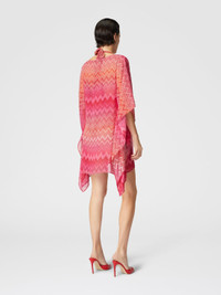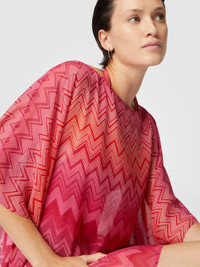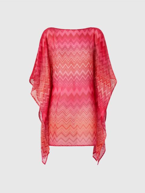 This short caftan, made of precious printed silk, stands out for its zigzag pattern, an unmistakable signature of Missoni. The wide sleeves and V-neck add a sense of lightness and sophistication, making it perfect for a chic summer look. The lightweight fabric and vibrant print make it a versatile garment, ideal for both the beach and for a refined summer look. MORE DETAILS - Short model kaftan - Printed Silk - Wide sleeves - Zig zag pattern Composition: EXTERNAL:100%Silk Care instructions: Ironing maximum temperature 110°C - without steam ; Dry cleaning in tetrachloroethene ; Do not tumble dry ; Do not wash ; Do not bleach Made in: Italy Product ID MC23SQ04BW00USS30EW