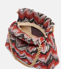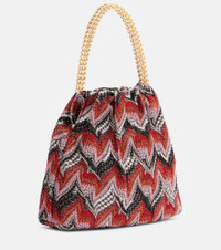 This clutch from Missoni features chain top handles with gold hardware and is adorned with an all-over zigzag pattern. Missoni's iconic Zig Zag pattern was first introduced in the 1950s and is now a symbol of Italian luxury. Product Details - Material: fabric - Lining: fabric - Made in Italy - Designer color name: Multi Red - Item color: red, black - Color of strap: gold - Top handles - Internal details: single compartment - Closure: magnetic fastening - Item number: P01063231 Size & Fit - Height 16cm-6.5" - Width 19cm-7.5" - Depth 5cm-2" - Chain length 29cm-11.5"