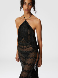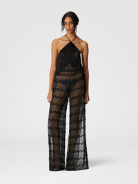 Evoking boho chic allure, Missoni's long jumpsuit in lame viscose lace explores sophisticated and creative elegance. The zig-zag pattern, enriched by the luminous reflections of lame, gives the fabric a unique texture, while the top decorated with light fringes adds a touch of movement. The fluid and enveloping silhouette enhances the figure with grace, making this garment distinctive and refined. MORE DETAILS - Long viscose jumpsuit - Fringed top - Zigzag pattern Composition: EXTERNAL:91%Rayon, 9%Metal Fiber Care instructions: Ironing maximum temperature 110°C - without steam ; Dry cleaning in tetrachloroethene ; Do not tumble dry ; Do not wash ; Do not bleach Made in: Italy Product ID MS25SG00BR00ZXS91N1