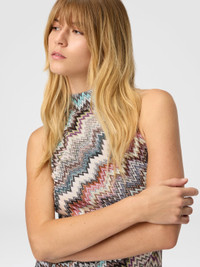 This women's mini dress with a halter neckline in pure viscose stands out for its raschel weave with a snake pattern, reminiscent of Missoni's signature designs. A bold and modern piece that combines lightness and unmistakable personality. MORE DETAILS - Women's mini dress - Halter neckline - Raschel knit with snake pattern - 100% viscose Composition: EXTERNAL:100%Rayon; INTERNAL:100%Polyester Care instructions: Dry cleaning in tetrachloroethene - mild process ; Wash max 30°C - Very mild process ; Steam iron only ; Do not tumble dry ; Dry flat ; Do not iron ; Do not bleach Made in: Italy Product ID DS25WG2SBR012GSM9QW