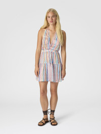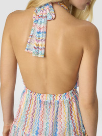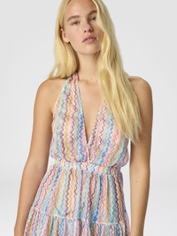 Effortless elegance and a vacation spirit come together in this short women’s beach dress featuring Missoni’s iconic zigzag motif it boasts a deep V‑neckline at the front and a seductive open back with tie closure. The tiered skirt adds a dynamic feminine touch making it perfect for chic moments in the sun. MORE DETAILS - Short cover-up dress - Tiered skirt design - Deep neckline and neck tie - Iconic zig zag pattern Composition: EXTERNAL:100%Polyester Care instructions: Ironing maximum temperature 110°C - without steam ; Dry cleaning in tetrachloroethene ; Do not tumble dry ; Do not wash ; Do not bleach Made in: Italy Product ID MC25SQ06BR0130SM9QJ