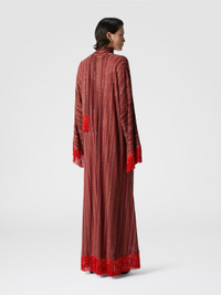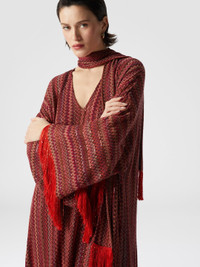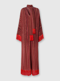 Long long-sleeved kaftan in lame viscose, enriched with the maison's iconic zigzag motif, with tone-on-tone sequins for a brilliant luminous effect. With a sleek V-neck and a removable fringed scarf, this kaftan offers versatility and movement. The fluid and luxurious silhouette makes it perfect for those who want a refined and comfortable look, ideal for any special occasion. MORE DETAILS - Palazzo trousers - Viscose processing - Lace pattern Composition: EXTERNAL:88%Rayon, 6%Metal Fiber, 6%Polyamide Care instructions: Dry cleaning in tetrachloroethene - mild process ; Ironing maximum temperature 110°C - without steam ; Wash max 30°C - Mild process ; Steam iron only ; Do not tumble dry ; Dry flat ; Do not iron ; Do not wash ; Do not bleach Made in: Italy Product ID DS25SG24BR010YS5076