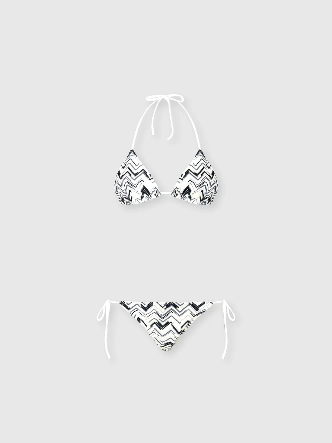 Refined and refined, the viscose-blend bikini with a slub zigzag pattern captures the essence of luxury beachwear by Missoni. Composed of a triangle top and a slip with laces, the model stands out for its play of colors and rich texture, which enhances the silhouette with natural elegance. MORE DETAILS - Viscose bikini - Flaming zigzag pattern - Triangle top - Briefs with laces Composition: EXTERNAL:65%Rayon, 29%Polyamide, 6%Elastane; LINING : 80%Polyamide, 20%Elastane Care instructions: Hand wash ; Do not tumble dry ; Do not dry clean ; Do not iron ; Do not bleach Made in: Italy Product ID MC22SP00BJ00NBS91NP