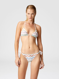Bikini with triangle bra with the iconic zigzag pattern of the Missoni maison in a 3D variant illuminated by the metallic reflections conferred by lame and embellished with raschel workmanship. The briefs with side ties offer a personalized fit while the triangle design enhances the decollete, maintaining the balance between aesthetics and comfort, for an iconic and functional style. MORE DETAILS - Triangle bikini - 3D Zig Zag Pattern - Raschel and lame processing - Briefs with laces Composition: EXTERNAL:61%Rayon, 30%Polyester, 9%Metal Fiber; LINING : 80%Polyamide, 20%Elastane Care instructions: Hand wash ; Do not tumble dry ; Do not dry clean ; Do not iron ; Do not bleach Made in: Italy Product ID MC22SP00BR0101SM9KZ