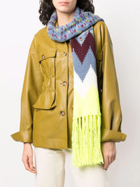 zigzag knitted scarf multicolour wool blend zigzag embroidery fringed edge Made in Italy Composition Wool 71%, Acrylic 23%, Polyester 6% SIZE & FIT Model measurements Height 5 ft 10 in(1.79 m) Bust/Chest 33.07 in(84 cm) Hips 35.82 in(91 cm) Waist 24.01 in(61 cm) Measurement LENGTH 86.61 in(220 cm) WIDTH 12.2 in(31 cm) Washing instructions Dry Clean Only