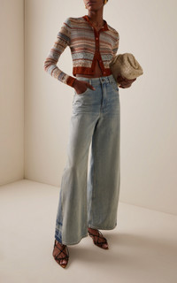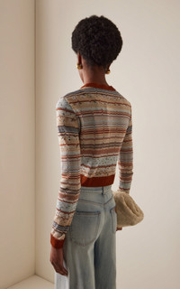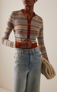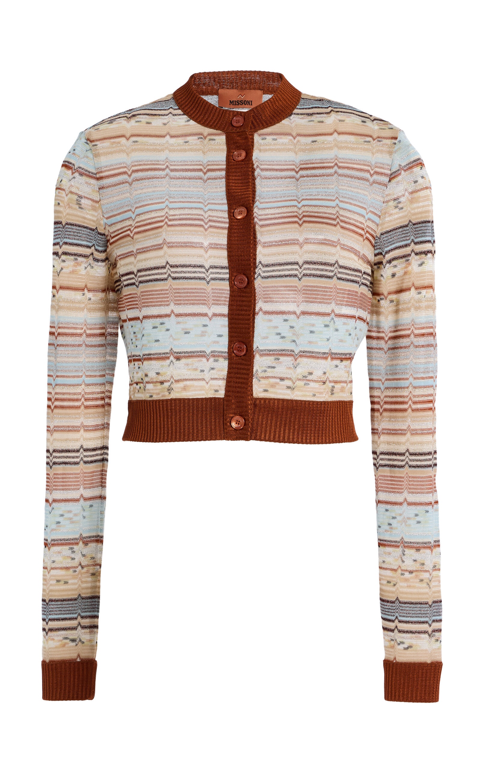 Few labels do relaxed glamour quite like storied Italian house Missoni. Showcasing the house's incredible knitwear, this crewneck cardigan has a slightly cropped silhouette with ribbed edges. PRODUCT DETAILS - Spring '25 - Button fastening - Composition: 65% rayon, 27% cotton, 8% metal fiber - Dry cean - Made in Italy SIZE & FIT - Our model is wearing a size IT 38 - Model is 5'10" with a 31" bust, 23.5" waist, and 33.5" hip