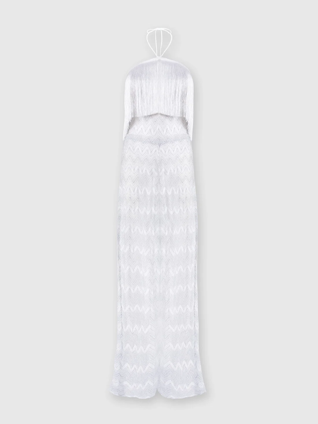 Evoking boho chic allure, Missoni's long jumpsuit in lame viscose lace explores sophisticated and creative elegance. The zig-zag pattern, enriched by the luminous reflections of lame, gives the fabric a unique texture, while the top decorated with light fringes adds a touch of movement. The fluid and enveloping silhouette enhances the figure with grace, making this garment distinctive and refined. MORE DETAILS - Long viscose jumpsuit - Fringed top - Zigzag pattern Composition: EXTERNAL:91%Rayon, 9%Metal Fiber Care instructions: Ironing maximum temperature 110°C - without steam ; Dry cleaning in tetrachloroethene ; Do not tumble dry ; Do not wash ; Do not bleach Made in: Italy Product ID MS25SG00BR00ZXS01FJ