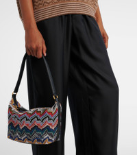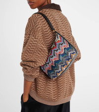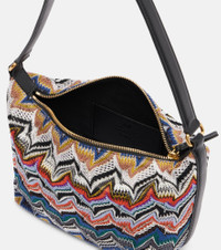 Missoni's zigzag shoulder bag see's the brand's signature pattern applied to a statement-making accessory. It features a roomy interior with a card slot and is finished with leather trims and closes with a zipper pull. Product Details - Material: fabric - Lining: fabric - Made in Italy - Designer color name: Multi Blue - Item color: multicolor - Trim: leather - Top handle - Color of strap: black - Internal details: single compartment, card slot - Closure: zipped top - Hardware color: gold - Item number: P01063232 Size & Fit - Height 13cm-5" - Width 24cm-9.5" - Depth 8cm-3" - Length of handles 50cm-19.5"