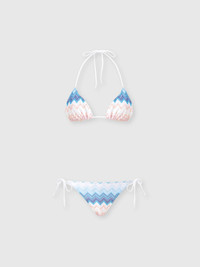 Crafted from a viscose blend, this triangle bikini features a gradient raschel knit enriched with lurex filaments. The zigzag pattern, enhanced by vibrant and iridescent shades, gives the garment a unique visual dynamism. The lame fabric brings brightness and sophistication, for a bold look full of details that stand out with elegance. MORE DETAILS - Classic bikini with triangle bra - Viscose blend workmanship - Iconic zig zag pattern - Lame filaments Composition: EXTERNAL:90%Rayon, 6%Polyester, 4%Polyamide; LINING : 80%Polyamide, 20%Elastane Care instructions: Hand wash ; Do not tumble dry ; Do not dry clean ; Do not iron ; Do not bleach Made in: Italy Product ID MC22SP00BR00ZYSM9MW