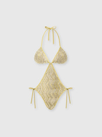Between transparency and shimmer, this trapeze trikini for women in lame viscose-blend mesh with zigzag motif and sequins interprets Missoni’s sensuality with refined lightness. MORE DETAILS - Women's trapeze trikini - Zigzag mesh knit - Viscose lame Composition: EXTERNAL:87%Rayon, 7%Metal Fiber, 6%Polyamide; LINING : 80%Polyamide, 20%Elastane Care instructions: Hand wash ; Do not tumble dry ; Do not dry clean ; Do not iron ; Cool Hand Wash ; Do not bleach Made in: Italy Product ID MS26SP0RBV00ITS10C4