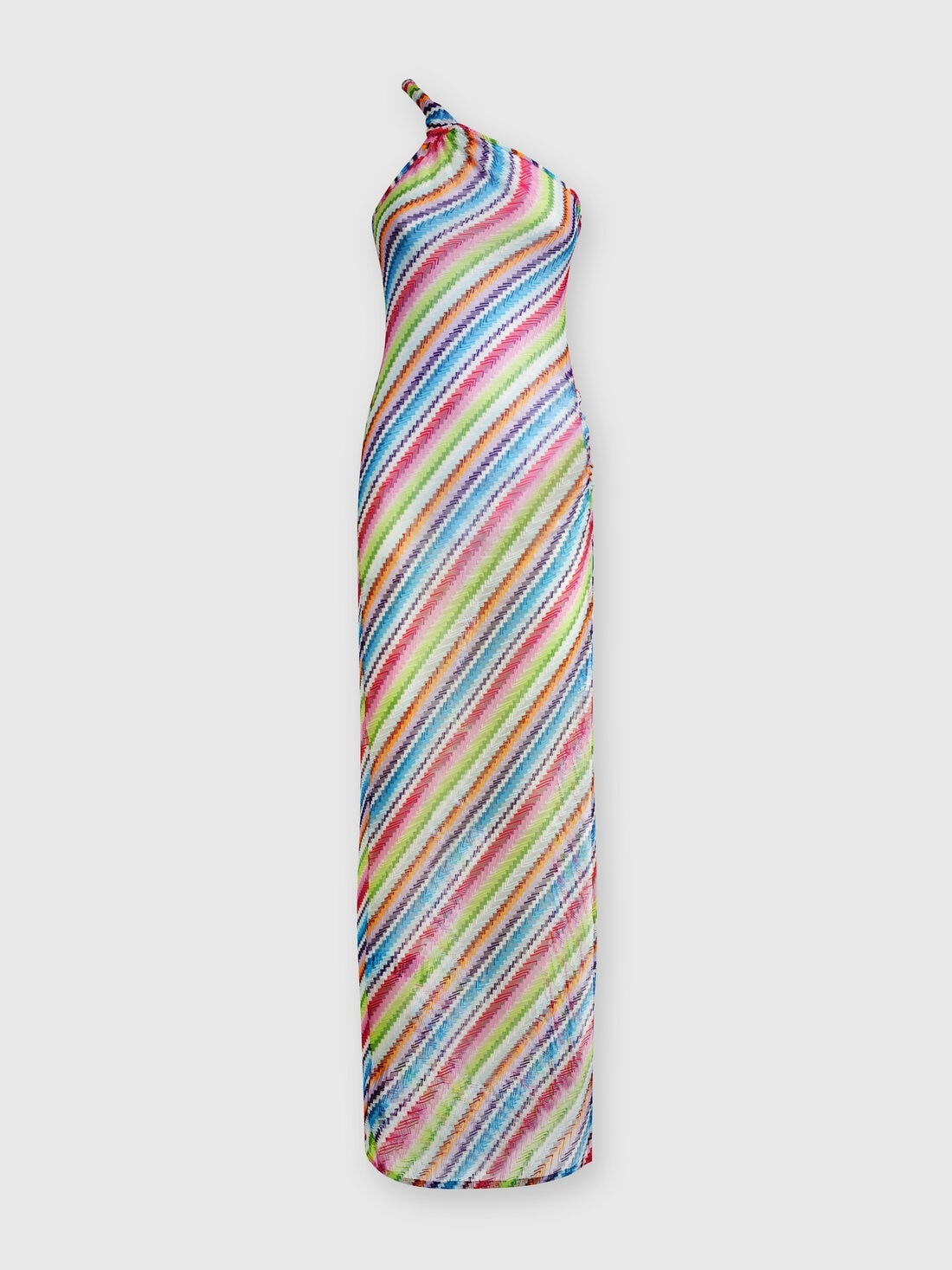 Playing with the see-through effect of the light fabric, enlivened by the raschel workmanship with vertical zigzag print, the one-shoulder cover-up dress. Featuring a torchon shoulder strap and a wide side slit, the garment is the quintessential Missoni beach style. MORE DETAILS - One-shoulder cover-up dress - Raschel Processing Fabric - Zig Zag Print - Torchon epaulettes - Side slit Composition: EXTERNAL:100%Polyester Care instructions: Ironing maximum temperature 110°C - without steam ; Dry cleaning in tetrachloroethene ; Do not tumble dry ; Do not wash ; Do not bleach Made in: Italy Product ID MS24WQ04BR00Z4SM9HA