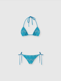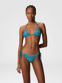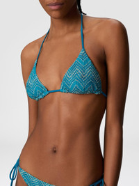 Straight from the maison's archive, the iconic chevron motif takes on new life in the viscose bikini by Missoni. The triangle bra and the briefs with side ties offer an adjustable fit, enhancing the silhouette with a refined sensuality. The addition of lame yarn gives a touch of light and dynamism, for a bright and sophisticated look. MORE DETAILS - Viscose and lame triangle bikini - Chevron pattern - Briefs with laces Composition: EXTERNAL:91%Rayon, 9%Metal Fiber; LINING : 80%Polyamide, 20%Elastane Care instructions: Hand wash ; Do not tumble dry ; Do not dry clean ; Do not iron ; Do not bleach Made in: Italy Product ID MC22SP00BR00ZXS614P