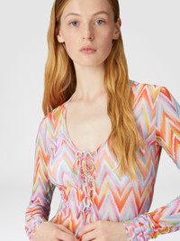 Made from printed tulle with the iconic zigzag pattern, this form-fitting long cover-up combines style and comfort. The long sleeves and adjustable neckline tie make it versatile, perfect for those who love attention-grabbing details. MORE DETAILS - Women's long cover-up - Long sleeves - Printed tulle workmanship Composition: EXTERNAL:93%Polyamide, 7%Elastane Care instructions: Ironing maximum temperature 110°C - without steam ; Dry cleaning in tetrachloroethene ; Do not tumble dry ; Do not wash ; Do not bleach Made in: Italy Product ID MC25SQ0BBJ00OESM9QZ