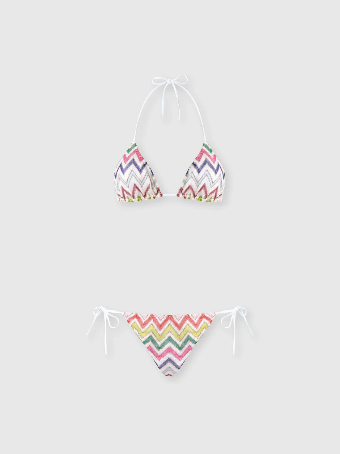 Classic bikini crafted in raschel knit with adjustable ties behind the neck and on the bottoms for a custom fit. The viscose and lame blend fabric is decorated with Missoni’s iconic zigzag motif adding a stylish luminous touch to your beach look. MORE DETAILS - Triangle bikini - Chevron pattern - Viscose and lame blend Composition: EXTERNAL:60%Rayon, 25%Polyester, 15%Metal Fiber; LINING : 80%Polyamide, 20%Elastane Care instructions: Hand wash ; Do not tumble dry ; Do not dry clean ; Do not iron ; Do not bleach Made in: Italy Product ID MC22SP00BR012RSM9QI