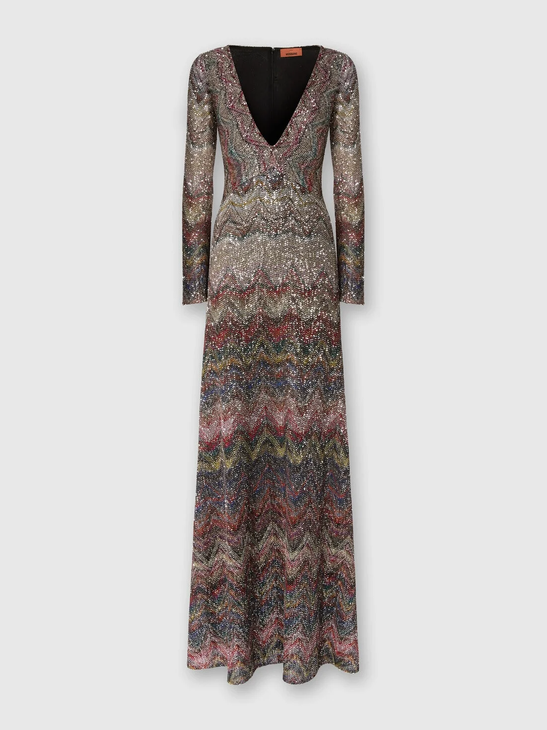 This flared long dress with deep V-neck and long sleeves enchants with its blend of elegance and boldness. Crafted using the fine Caperdoni loom, the fabric showcases a zigzag pattern enriched with lame threads and gradient sequins, creating a shimmering, dynamic effect that captures the light. MORE DETAILS - Flared long dress - V-neckline - Caperdoni loom knit - Gradient zig zag motif - Lurex threads and sequins - Viscose blend Composition: EXTERNAL:55%Rayon, 41%Polyamide, 4%Metal Fiber; LINING : 82%Polyester, 18%Elastane Care instructions: Dry cleaning in tetrachloroethene - mild process ; Do not tumble dry ; Steam iron only ; Dry flat ; Do not wash ; Do not iron ; Do not bleach Made in: Italy Product ID DS25WG1MBC005ES4176