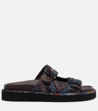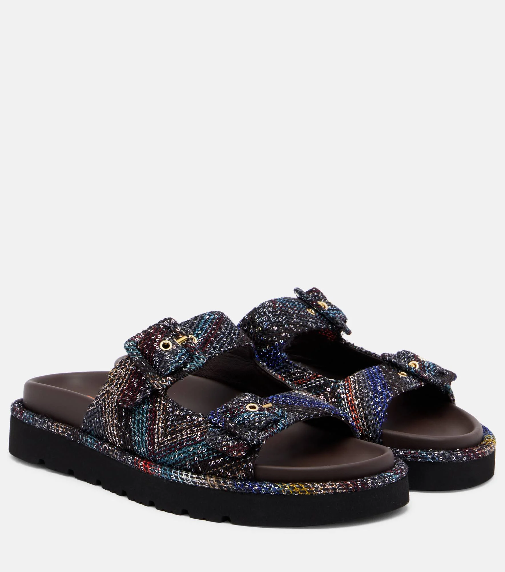 Trimmed with Missoni's signature zigzag fabric with sequined embellishments, these leather sandals offer comfort and style. The pair fastens with adjustable buckles and features contoured insoles. Product Details - Upper: leather - Lining: leather - Sole: leather insole, rubber sole - Toe shape: round open toe - Made in Italy - Includes: dust bag - Designer color name: Dark brown/multicolor - Item color: multicolor - Closure: buckle fastening - Hardware color: gold - Contains non-textile parts of animal origin - Item number: P01063737 Size & Fit - Fits slightly large to size - we recommend trying a half size smaller - European sizes - 3,5cm-1.5" platform (size EU 38) - 4cm-1.5" wedge heel (size EU 38)