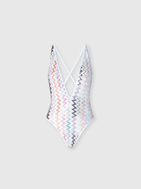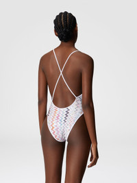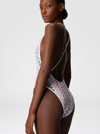 A sophisticated women’s one-piece swimsuit, featuring a V-neckline and Raschel lacework embellished with sequins. The iconic zigzag pattern and open back complete a design that blends class and sensuality. MORE DETAILS - Women's one-piece swimsuit - V-neck - Iconic zig zag pattern - Raschel workmanship with sequins - Open back design Composition: EXTERNAL:64%Rayon, 36%Polyester; LINING : 80%Polyamide, 20%Elastane Care instructions: Hand wash ; Do not tumble dry ; Do not dry clean ; Do not iron ; Do not bleach Made in: Italy Product ID MC22SP03BR012VSM9QG