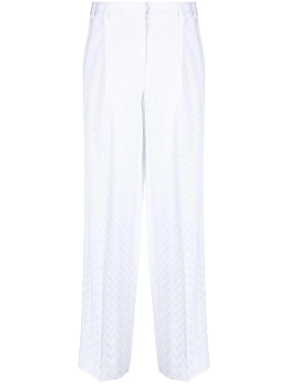 zigzag tailored trousers Missoni is an Italian luxury fashion house known for using bold prints and details in every creation. These wide-leg trousers are crafted com a cotton blend and enhanced with a zigzag pattern all over. Highlights - White - Cotton blend - Zigzag print - Pleat detailing - High-waisted - Belt loops - Concealed front fastening - Rear welt pocket - The item you receive may differ slightly from the item photographed. this is due to the artisanal nature with which all missoni products are constructed. Made in Italy Composition Outer: Cotton 74%, Viscose 26% Lining: Cupro 100%, Polyester 100% Washing instructions Dry Clean Only