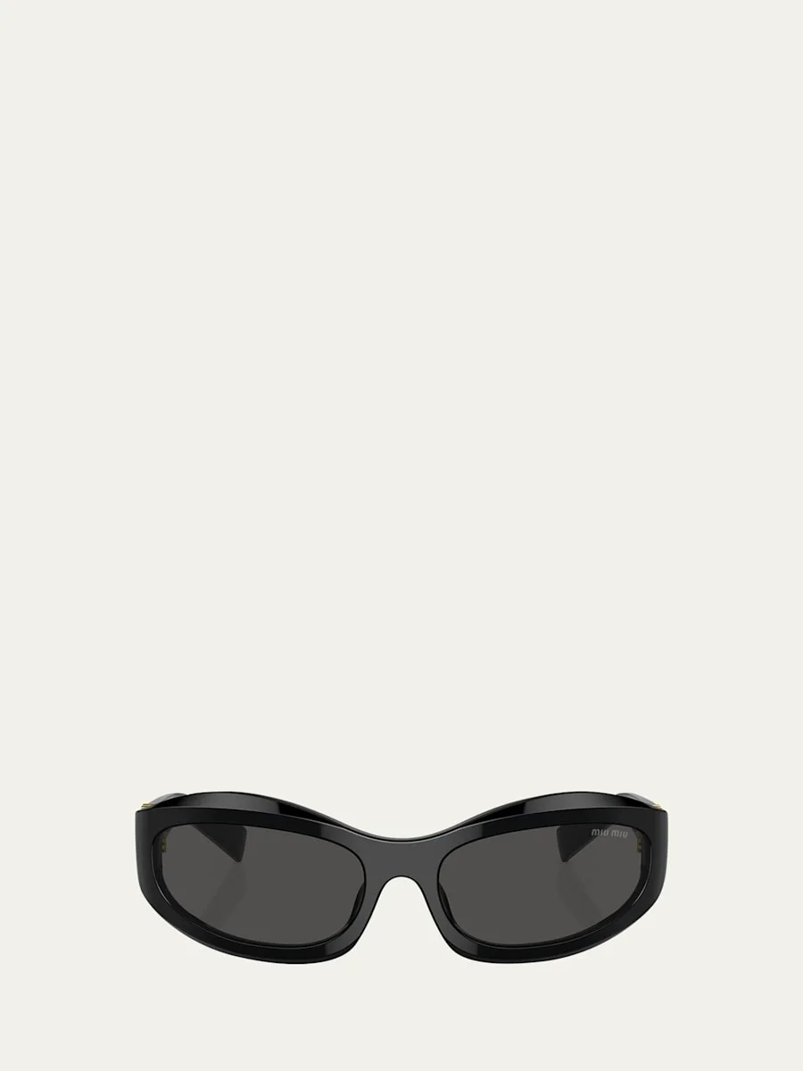 Miu Miu "14ZSF" oval sunglasses in acetate Featuring a contemporary wrap-around shape Solid-color lenses Logo on temples Thin, tapered arms Spot clean Each pair of sunglasses comes with a cleaning cloth and case to clean and protect your sunglasses from scratches and damage. 100% UVA/UVB protection Made in Italy Proposition 65 warning for California residents Online Inquiries: BGS21_D5JM2| Store Inquiries: #4924327