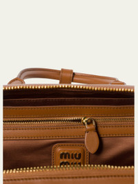 Miu Miu "Arcadie" top handle bag in leather Rolled top handles with snap strap Detachable, adjustable leather crossbody strap Can be worn as a top handle or shoulder/crossbody bag Twoway zip top closure Interior, one zip pocket Goldtone hardware Cotton/poly padding Lining: Cotton/satin Feet protect bottom of bag Made in Italy