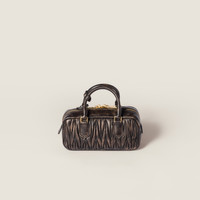 The texture of the aged nappa leather reinterprets the refined matelasse craftsmanship of the Arcadie bag, giving new character to the top-handle design, an emblem of Miu Miu's experimentation and mixing vintage and contemporary. - Product code: 5BB142_AF6Q_F0201_V_OON - Double leather handles - Detachable, adjustable leather shoulder strap. Minimum length: 105 cm - Maximum length: 115 cm - Minimum drop: 53 cm - Maximum drop: 57 cm - Gold-tone hardware - Zipper closure - With feet - Removable leather mirror case - Cotton satin lining with zipper pocket - Metal lettering logo on the front - Imported Height 10.5cm Width 22cm Length 7.5cm Materials Main material: Lambskin