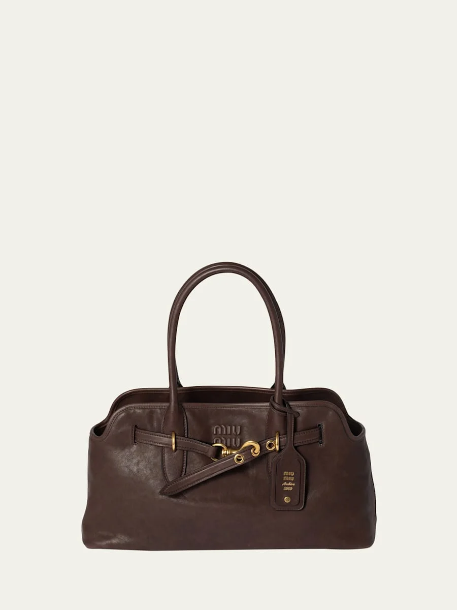 Miu Miu "Aventure" sleek and casual shoulder bag crafted in lambskin leather Rolled shoulder straps Removable logoprint tag Open top Adjustable belt strap detail with lobster clasp Interior, one zip pocket and one slip pocket Feet protect the bottom of the bag Approx. 8.6"H x 17.3"W x 5.7"D Made in Italy