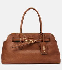 Crafted from supple leather, the Aventure Large tote bag from Miu Miu is a contemporary take on the brand's iconic 2009 model. The versatile design features a removable leather pendant, snap hook detailing, and embossed logo lettering on the front. Product Details - Material: leather - Lining: fabric - Made in Italy - Designer color name: Rovere - Item color: brown - Internal details: internal zipped pocket, internal slot pockets, single compartment - Closure: open top - Top handles - Hardware color: gold - Includes: dust bag - Item number: P01084283 Size & Fit - Height 24cm-9.5" - Width 46cm-18" - Depth 14cm-5.5" - Length of handles 51cm-20"