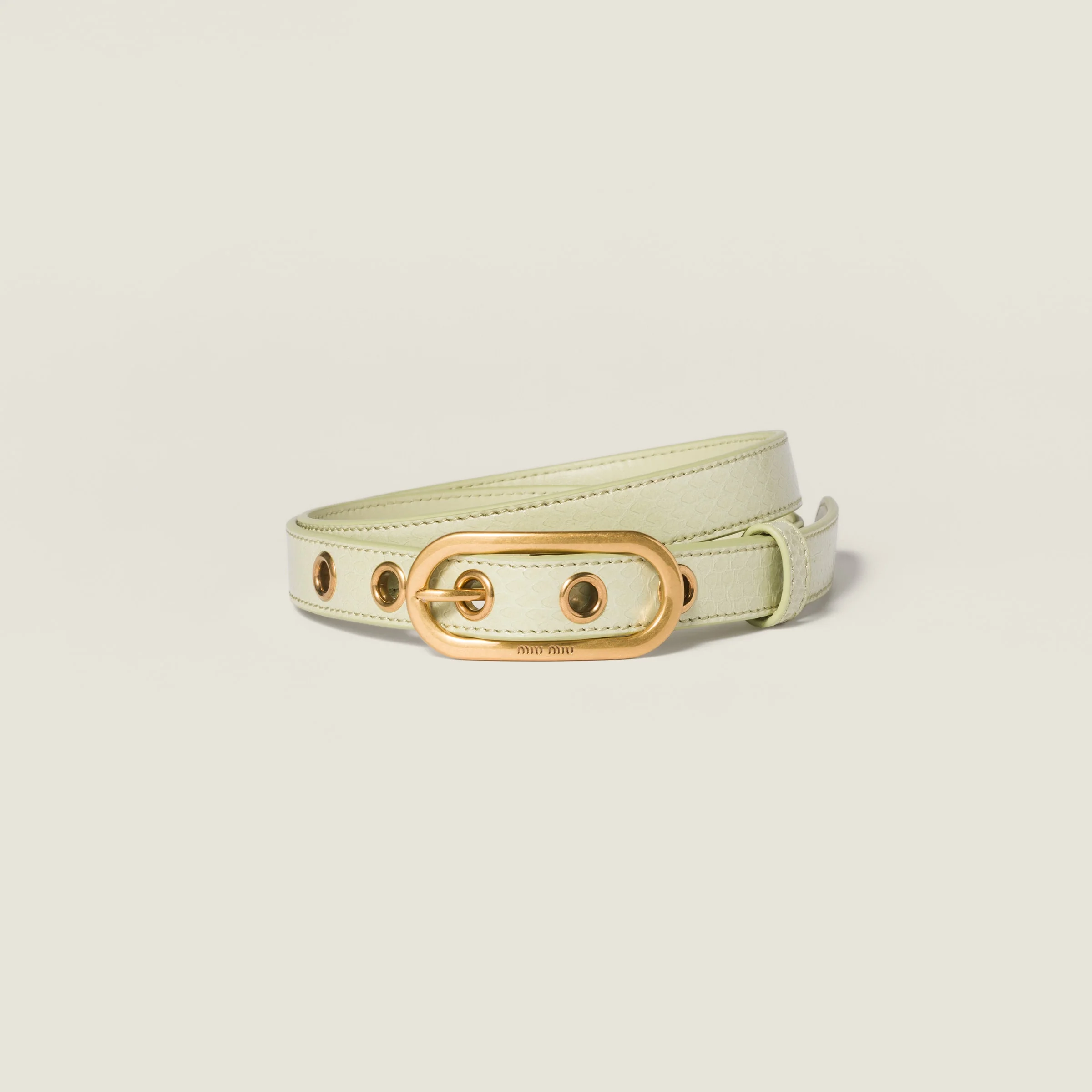 Fine Ayers leather with its luminous texture reveals a contemporary boldness that adds character and elegance to the simple lines of this belt. - Product code: 5CC700_2AMP_F0362 - With eyelets - Metal buckle - Visible logo on buckle - Imported Height 1.8cm Materials Main material: Masked Watersnake