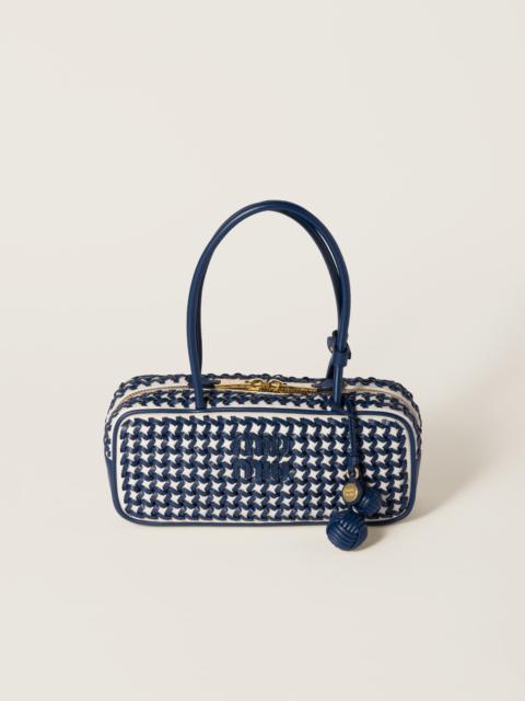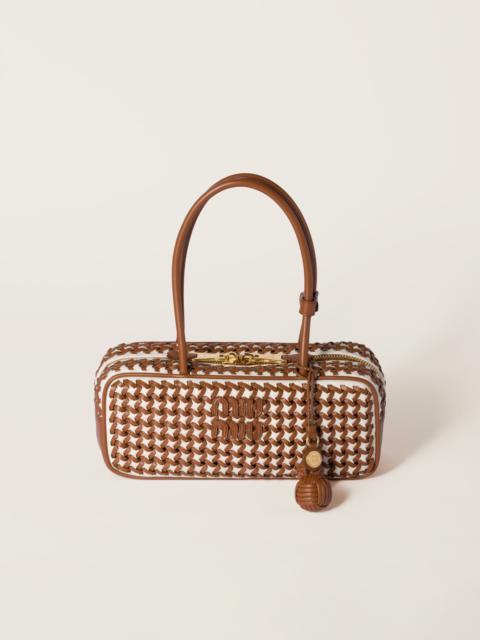 The precious weave of soft leather enriches the silhouette of this Beau bag, made unique by the elegant two-tone motif and special trick that enhances Miu Miu's bold experimentation. - Product code: 5BB173_2IBM_F0X63_V_OIM - Woven workmanship - Leather handles - Removable trick - Gold-tone hardware - Zipper closure - Cotton gabardine interior with zipper pocket - Leather lettering logo on the front - Imported Height 11.5cm Width 28cm Length 8cm Materials Main material: Calfskin