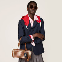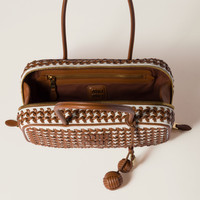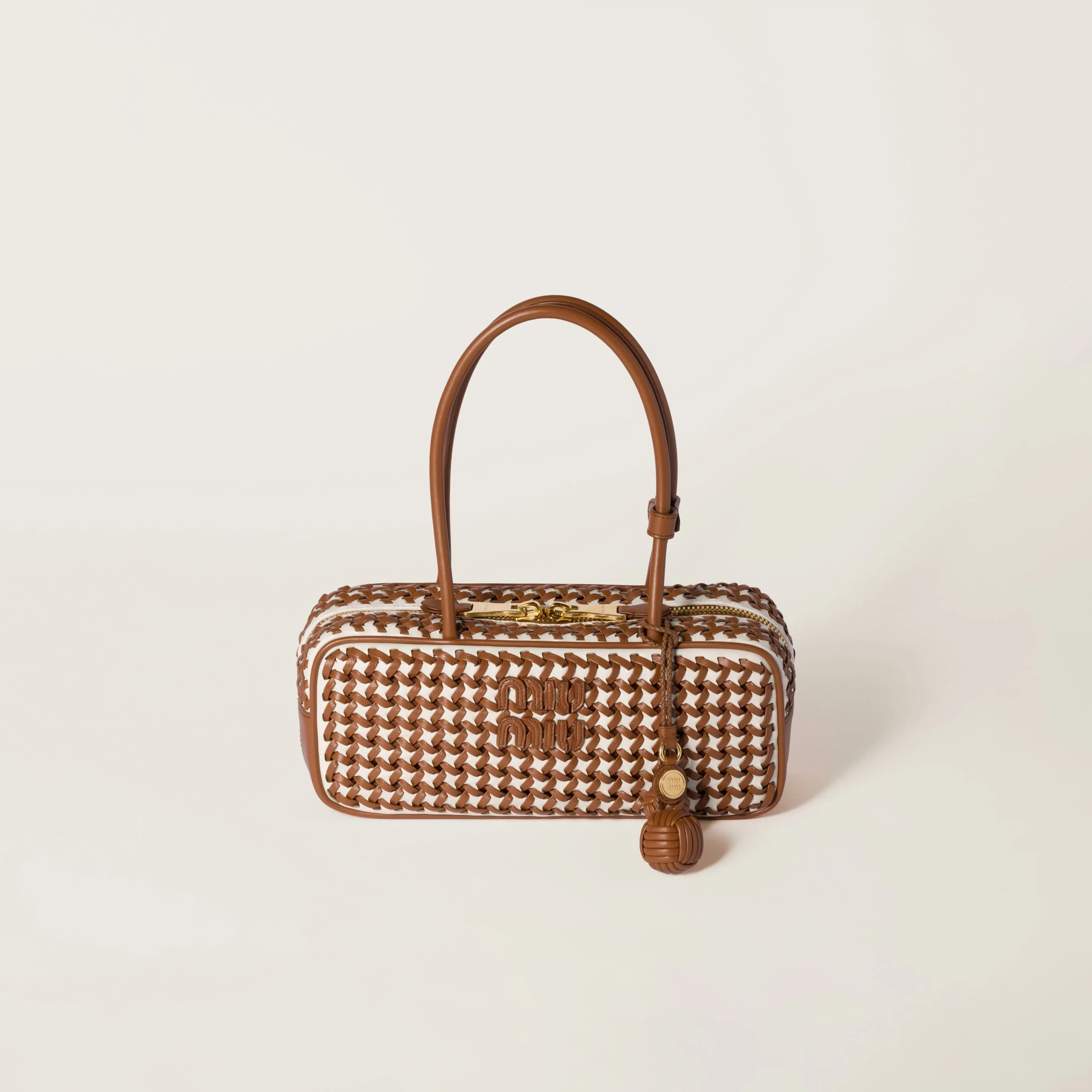 The precious weave of soft leather enriches the silhouette of this Beau bag, made unique by the elegant two-tone motif and special trick that enhances Miu Miu's bold experimentation. - Product code: 5BB173_2IBM_F031W_V_OIM - Woven workmanship - Leather handles - Removable trick - Gold-tone hardware - Zipper closure - Cotton gabardine interior with zipper pocket - Leather lettering logo on the front - Imported Height 11.5cm Width 28cm Length 8cm Materials Main material: Calfskin