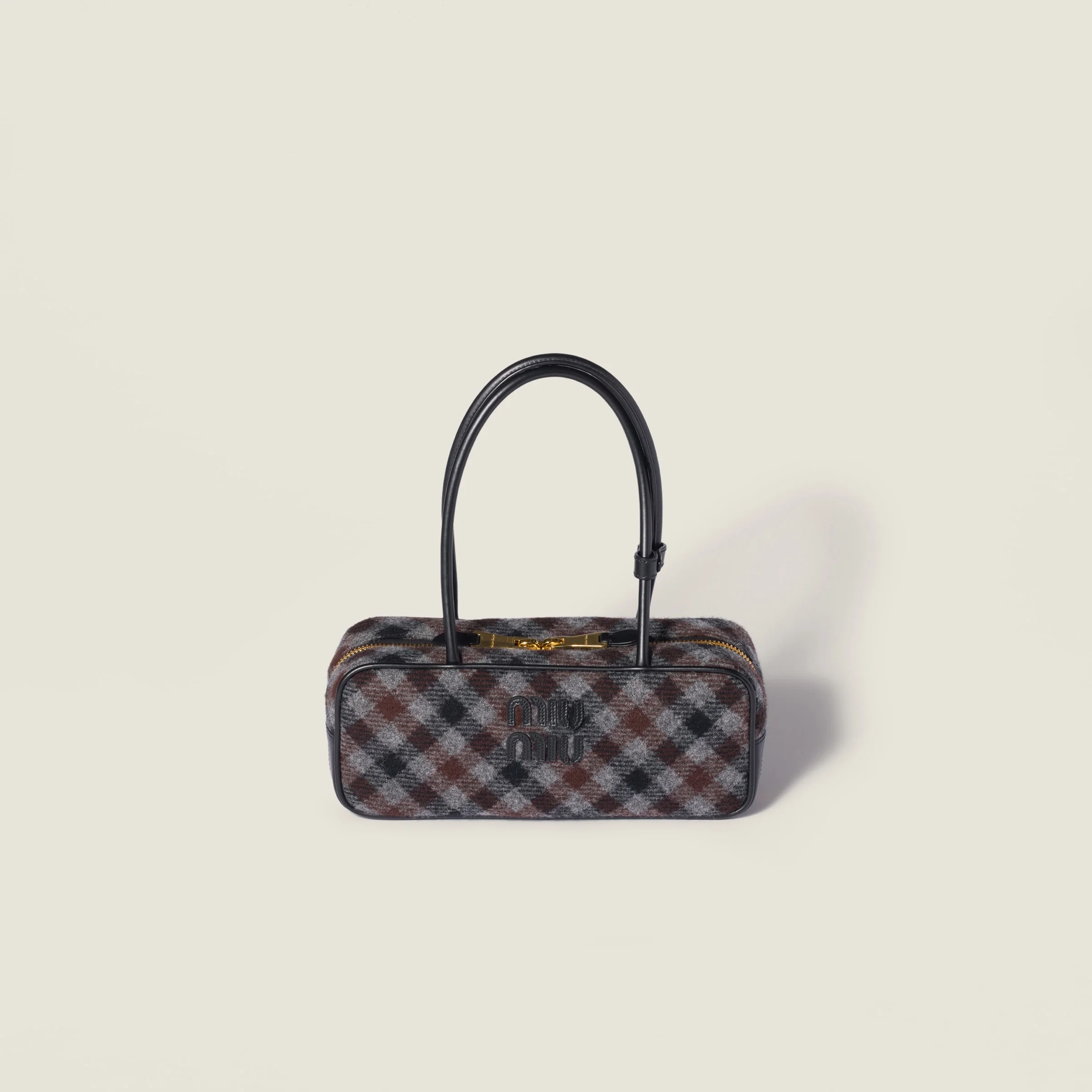 The timeless plaid motif enhances the vintage aesthetic and top-handle design of the Beau bag. The leather handles and logo in a contrasting color add an artisan touch to this versatile Miu Miu icon. - Product code: 5BB173_2IFK_F0RDS_V_OWM - Leather handles - Gold-tone hardware - Drill interior with zipper pocket - Leather lettering logo on the front - Imported Height 11.5cm Width 28cm Length 8cm Materials Main material: Polyamide Virgin Wool
