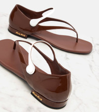 Uninhibited and deliberately subversive: these are the hallmarks of Miuccia Prada’s Miu Miu. These thong sandals are crafted in Italy from leather, and the square-toed silhouette is finished with contrasting upper straps and logo detailing on the heels. Product Details - Upper: calf leather - Lining: leather - Sole: leather insole and sole - Toe shape: square open toe - Made in Italy - Includes: shoe box - Designer color name: Palissandro+Bianco - Item color: brown, white - Item number: P01039792