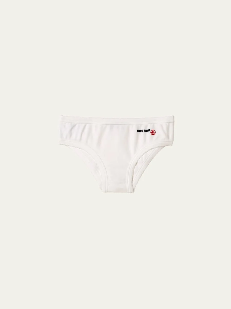 Miu Miu briefs are crafted of a soft cotton stretch with a logo embroidered hip Low rise waist Bikini-cut legs Moderate seat coverage Pull-on style Cotton/elastane Made in Italy Online Inquiries: BGS21_I2N95| Store Inquiries: #4993619