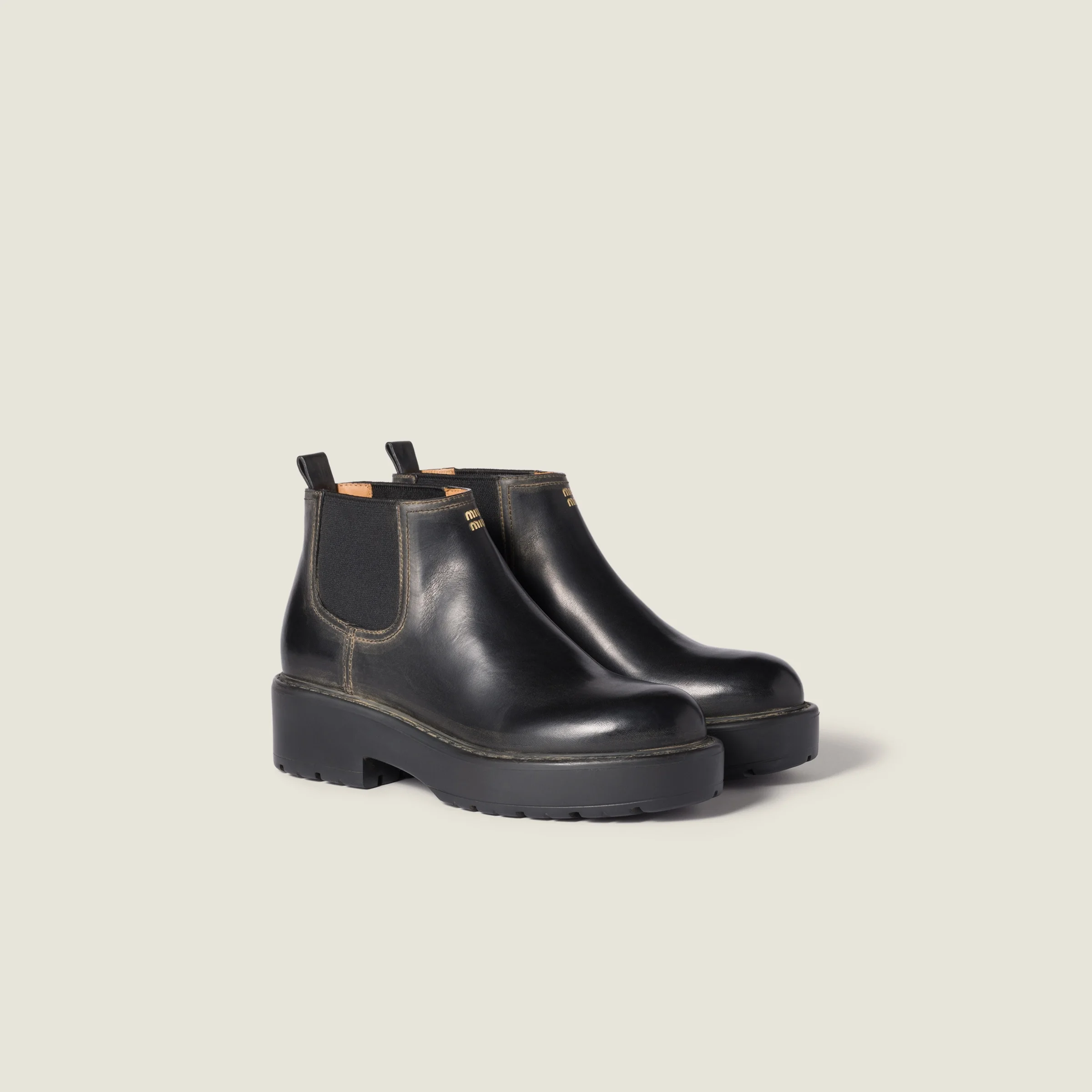 Formal inspiration meets a casual attitude in the lines of these calf leather booties with an antiqued treatment and rubber sole that evoke a vintage aesthetic and experimental reinterpretation of codes from the past. - Product code: 5T527E_5OD_F0002_F_055 - Leather lining - Elastic gusset - Boot leg: 10 cm - Rubber sole with logo - Heel height: 55 mm - Leather insole - Screen-printed logo on upper - Imported Materials Main material: Calfskin