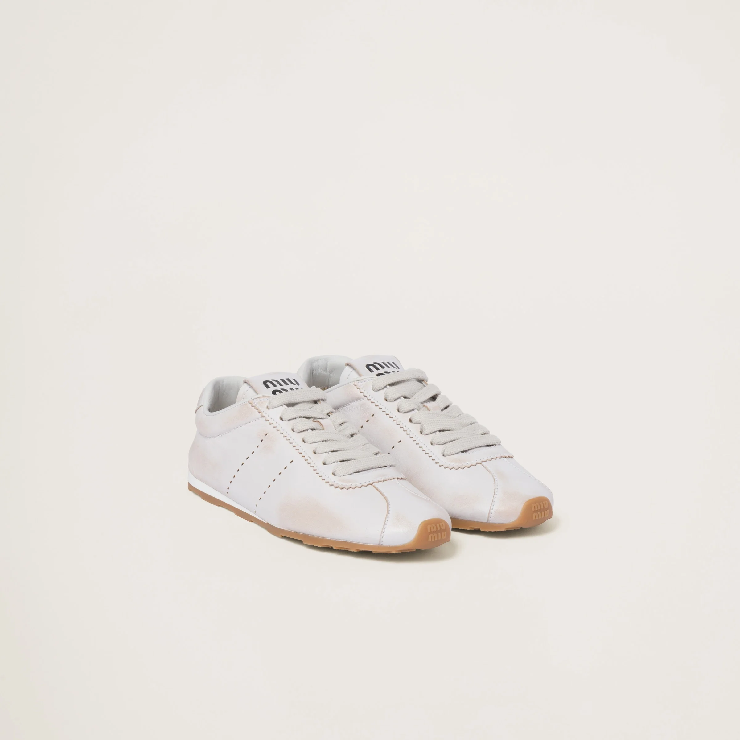 Refined workmanship and materials meet the sleek and extremely light design in these new Miu Miu bleached nappa leather sneakers. The logo stands out on the tongue and on the back thanks to its iconic character. - Product code: 5E114E_3H02_F0009_F_005 - Upper with perforated detail - Leather lining - Screen-printed logo on the tongue and heel - Closure with flat laces - Rubber sole - Patterned tread - Removable leather-covered insole - Imported Materials Main material: Lambskin