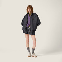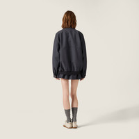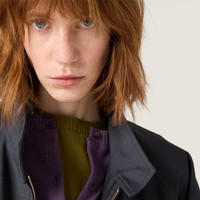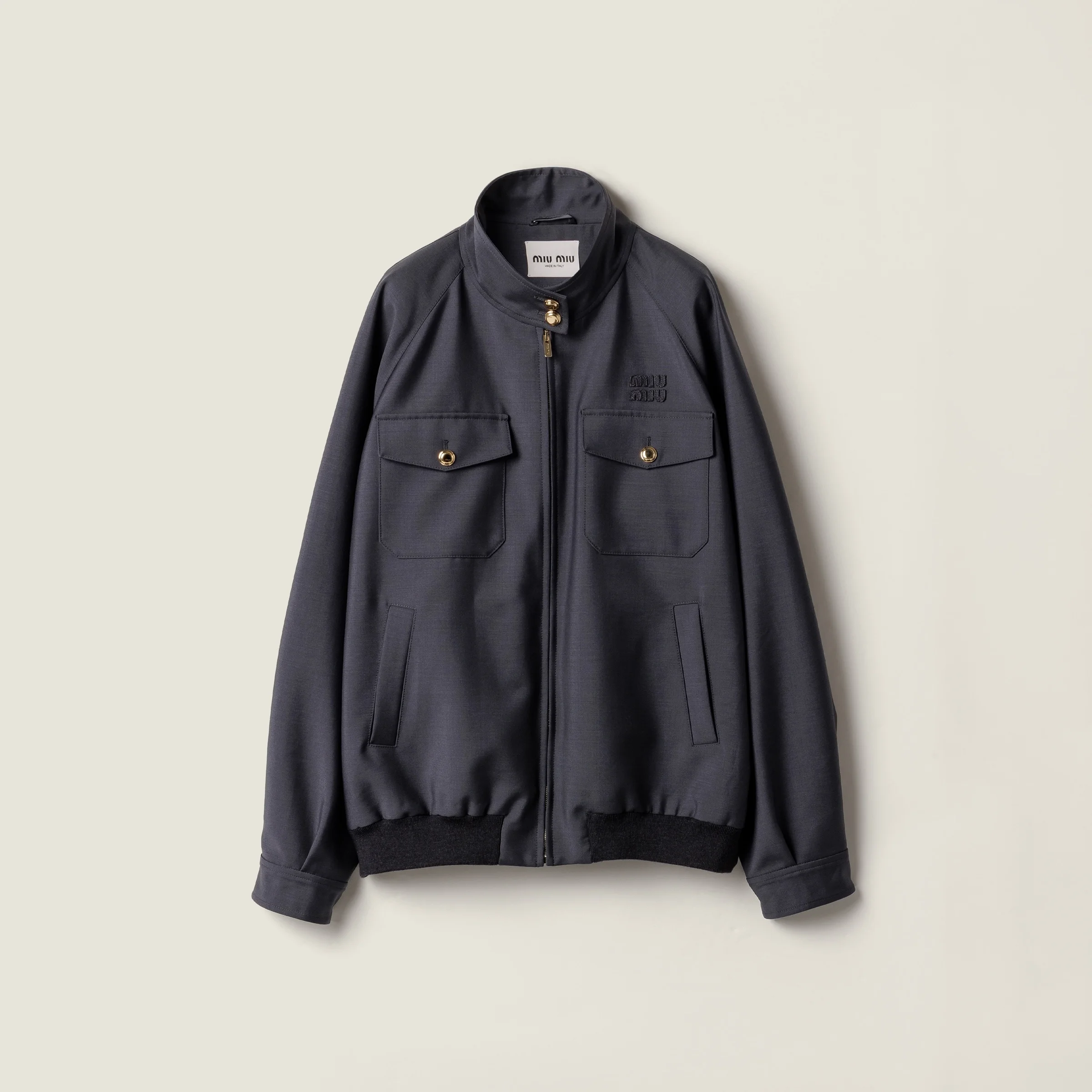 The Miu Miu blouson jacket with an ever-evolving design takes on the character of refined gray kid mohair enhanced by the bonded jersey backing and gold buttons: details that identify an unmistakable and experimental wardrobe. - Product code: ML1261_17NJ_F063H_S_OOO - Unlined garment - Long sleeves - Stand-up collar - Buttoned cuff - Zipper and button closure - Flapped patch pockets with buttons - Ribbed knit hem - Embroidered logo - Imported - The model is 181 cm tall and wears a size 38 Height 72cm Materials Main material: 60% Mohair 40% Virgin Wool