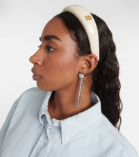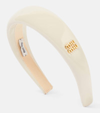 Miu Miu's youthful essence is spotlighted by this playful headband. Made of glossy patent leather, it boasts a padded oversized silhouette, gold-tone logo detailing, and a grosgrain inner. Product Details - Material: 100% leather - Care instructions: do not wash - Made in Italy - Designer color name: Avorio - Comes with dust bag - Comes with a box - Item number: P00840015 Size & Fit - Max. width 5cm-2"