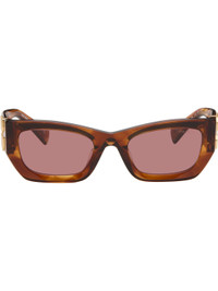 Tortoiseshell acetate-frame sunglasses. · Rectangular, cat-eye-style · Pink tinted lenses · Logo etched at lens · Integrated nose pads · Logo hardware at hinges · Core wire at temples · Leather case included · Size: 53.22 135 Supplier color: Striped tobacco/Dark violet Acetate. Made in Italy 261209F005058
