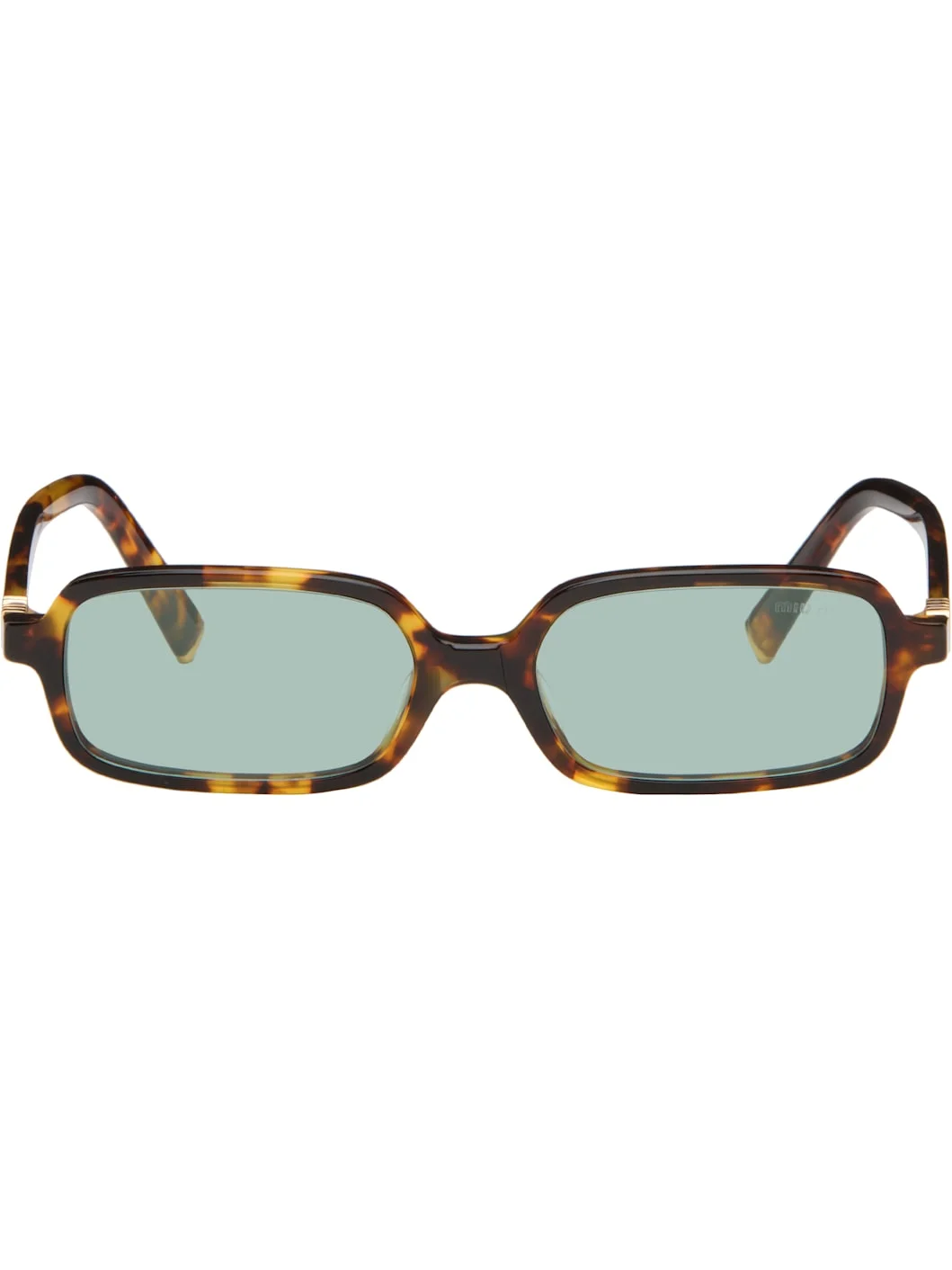 Rectangular semi-transparent tortoiseshell acetate-frame sunglasses. · Blue lenses · 100% UVA/UVB protection · Integrated nose pads · Exposed core wires · Logo hardware at temples · Includes case · Size: 58.18 140 Supplier color: Brown Acetate. Made in Italy 261209F005012