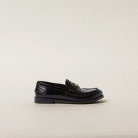 In the '50s, loafers were part of school uniforms worn by U.S. prep school and college students. Annoyed by having to wear a uniform, students started inserting a shiny penny in the slot of the leather band, giving rise to the name "Penny Loafers". Miu Miu gives this timeless footwear synonymous with tradition an update in a brushed leather version. - Product code: 5D773D_ULX_F0002_F_020 - Apron with leather strap and metal ornament - Leather lining - Embossed logo on the tongue - Rubber sole - Leather insole - Imported Materials Main material: Calfskin