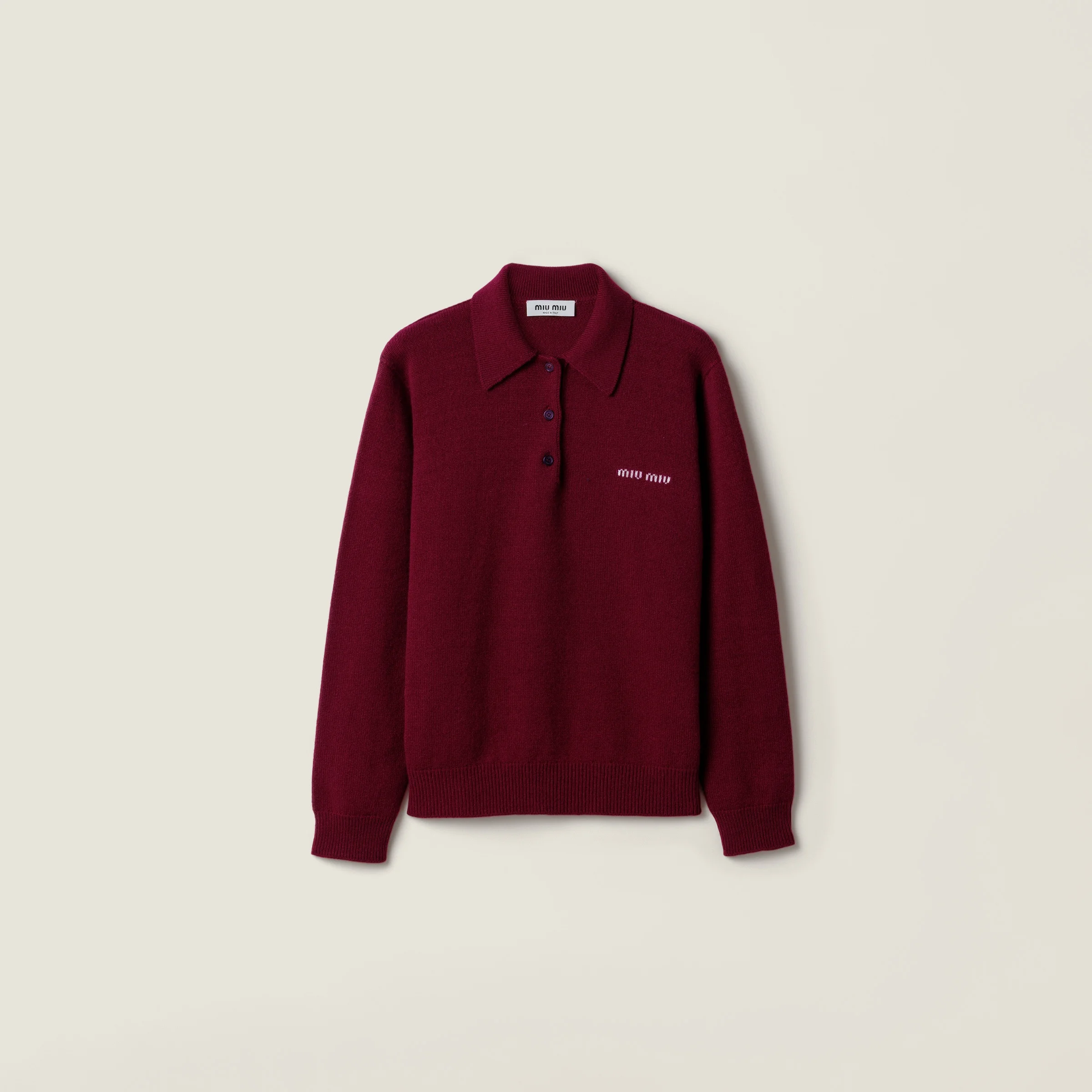 Soft cashmere enhances the clean lines of this polo, playing on symbols of the masculine wardrobe and reinterpreting an authentic Miu Miu staple with a contemporary twist. - Product code: MMLB71_17SA_F0399_S_OOO - Plain knit - Oversized fit - Long sleeves - Semi-raglan shoulder - Front button closure - Ribbed cuffs and hem - Intarsia logo - Imported - The model is 178 cm tall and wears a size 38 Height 63cm Materials Main material: 100% Cashmere