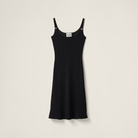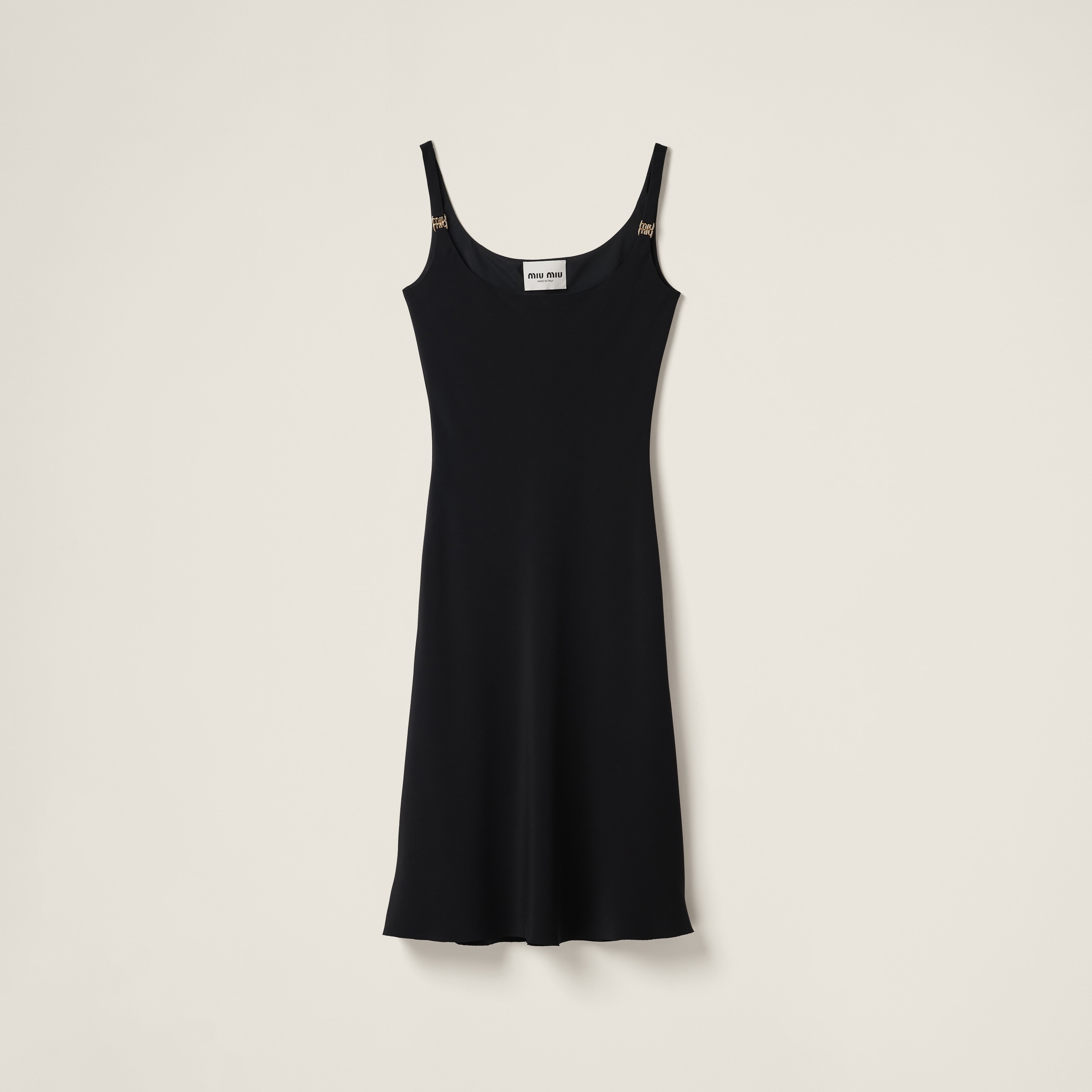 The new metallic Miu Miu logo stands out, thanks to its iconic touch, on the shoulder straps of this cady dress with sleek and versatile lines. - Product code: MF5220_139J_F0002_S_OOO - Flared fit - Lined - Scoop neck - Side zipper closure - Metal logo on the shoulder straps - Imported - The model is 178 cm tall and wears a size 38 Height 106cm Materials Main material: 100% Silk