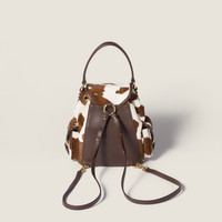 Vintage references and contemporary functionality define the style of this Miu Miu backpack, with a multi-pocket design and leather trim that are enhanced by the rebellious and experimental character of calf hair leather with a cow print. - Product code: 5BZ043_2ICT_F0EDH_V_OZO - Leather handle - Front zipper pocket - Side flap pockets - Gold-tone hardware - Flap closure with buckle - Cotton gabardine interior with patch pocket - Leather lettering logo on the flap - The bag can be worn as a classic backpack or a crossbody bag, combining two harness straps to form a long shoulder strap attached to metal hooks on the sides. - Imported Height 22cm Width 18cm Length 11.5cm Materials Main material: Calfskin
