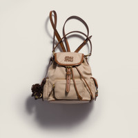 This canvas and leather backpack inspired by school gear combines artisan appeal and a casual attitude. The multi-pocket design and the option of wearing it as a crossbody bag express the contemporary and playful spirit of Miu Miu bags. - Product code: 5BZ043_2IBQ_F0DAB_V_OOM - Leather handle - Flap closure with strap and buckle - Front zipper pocket - Side flap pockets - Gold-tone hardware - Linen blend interior with patch pocket - The backpack can be worn in two different ways: classic backpack style with a minimum harness strap length: 65 cm - maximum harness strap length: 68 cm; crossbody style, shoulder strap length: 110 cm - drop: 53 cm - Leather lettering logo on the flap - Imported Height 22cm Width 18cm Length 11.5cm Materials Main material: Cotton