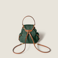 This canvas and leather backpack inspired by school gear combines artisan appeal and a casual attitude. The multi-pocket design and the option of wearing it as a crossbody bag express the contemporary and playful spirit of Miu Miu bags. - Product code: 5BZ043_2IBQ_F04VM_V_OOO - Leather handle - Front zipper pocket - Side flap pockets - Gold-tone hardware - Flap closure with buckle - Linen blend interior with patch pocket - Backpack can be worn in two ways: classic harness with straps, minimum length 65 cm, maximum length 68 cm, or crossbody strap, length 110 cm - drop 53 cm - Leather lettering logo on the flap - Imported Height 22cm Width 18cm Length 11.5cm Materials Main material: Cotton
