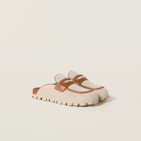 The casual, lifestyle attitude of these canvas mules is enhanced by leather details and the iconic coin, a bold, preppy element of Miu Miu style. - Product code: 5D377E_Q1D_F062F_F_010 - Upper with leather strap and logo-engraved metal coin - Leather lining - Leather insole - EVA sole - Star-patterned tread - Screen-printed logo - Imported Materials Main material: Cotton